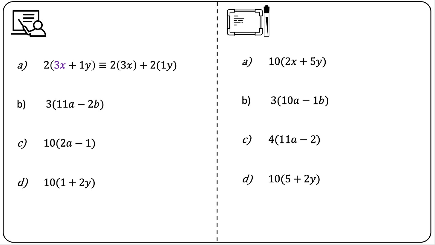 Show how to expand a single bracket by distributing the outside number across the two inside terms, then use “brackets means multipy” to finish expanding